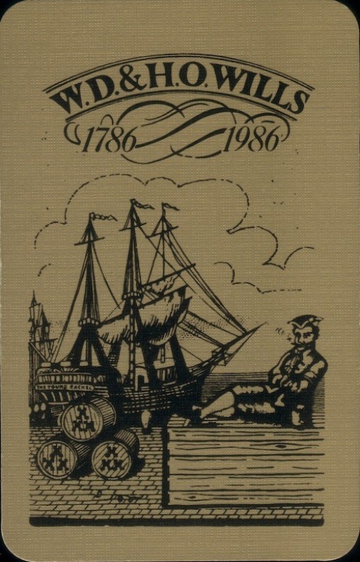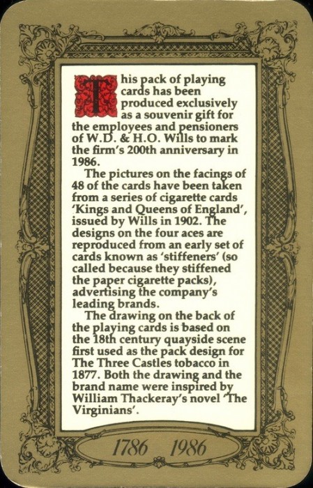 This deck was one of two released as a double deck set on the 200 year anniversary of W.D. & H.O. Wills. These sets were produced exclusively for the employees and pensioners of the company. The pictures used on the faces of the cards were taken from a series of 1902 cigarette inserts featuring the Kings and Queens of England. The aces were taken from a series of ad cards called stiffeners (they stiffened the paper cigarette packs. The drawing on the card backs is the 18th century quayside scene first used as the pack design for The Three Castles tobacco in 1877.
