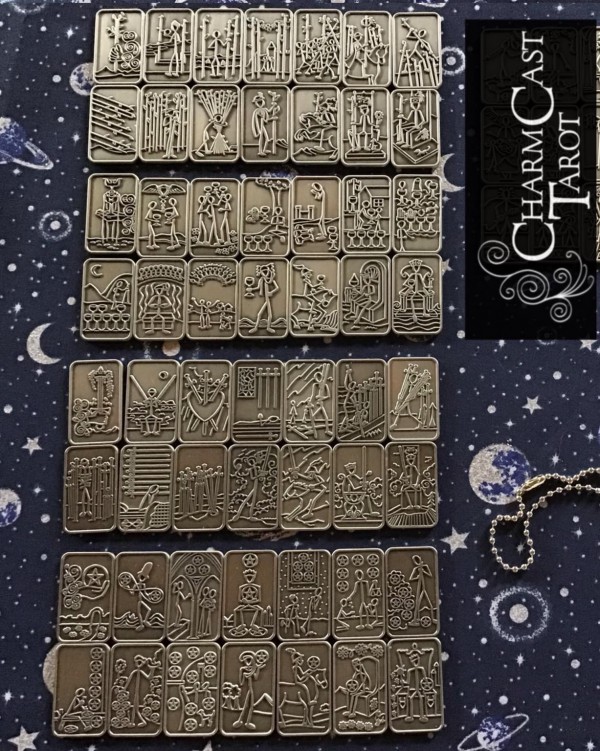 The CharmCast Tarot is a tiny, simple, doodle-based replication of the traditional Rider-Waite Smith tarot, and cast in tin-plated iron. They are meant to last a lifetime.