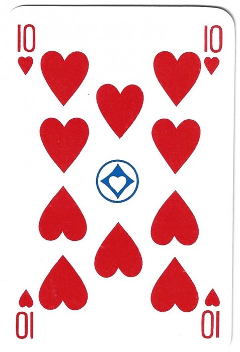 West German made deck of 52 cards and 3 jokers, commemorating the engagement of Prince Charles to Lady Diana Spencer in 1981. The cards are house in a clear hard plastic container only. There is a symbol on the ten of hearts: white heart in a blue diamond in a white circle, bordered in blue.