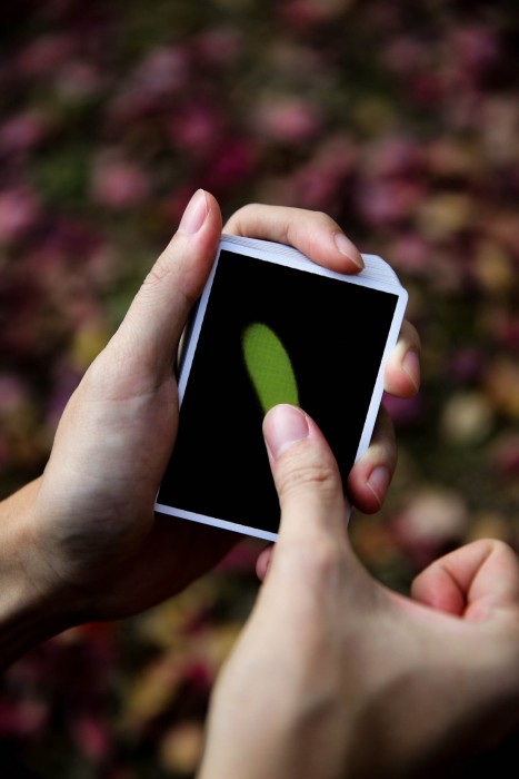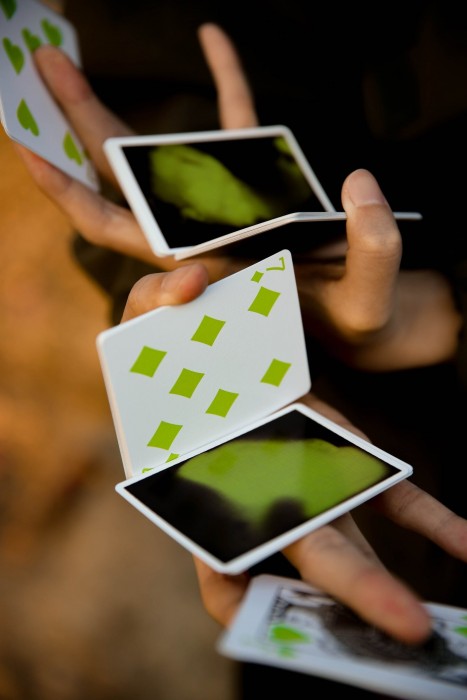Thermo Solid is the second iteration of the Solid series by LotusinHand. This deck features a full solid back made out of thermochromic ink. The technology of thermochromic ink allows the back color to change color from black to chameleon green if heat is applied. The red standard color for the pips and indices of red cards have been changed to chameleon green. The courts main picture is muted to grey. There are two extra cards: one features a joker showing a chameleon in thermo ink, and an ad card showing "GET GOOD" in thermo ink with an instruction of keeping the thermo ink last long on the back.