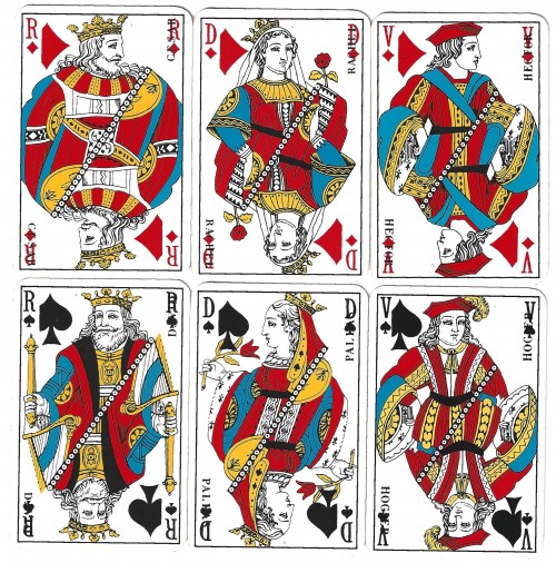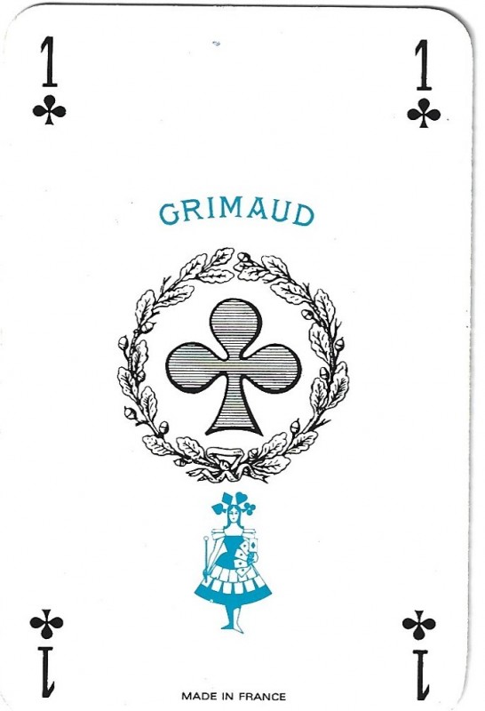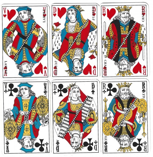 A standard short deck of 32 cards and no jokers, produced by Grimaud in France in the mid 80's. The suits run Ace (high) to 7 in each suit. The courts have individuals names as follows:
