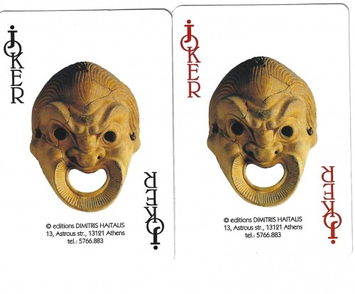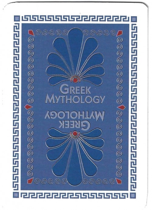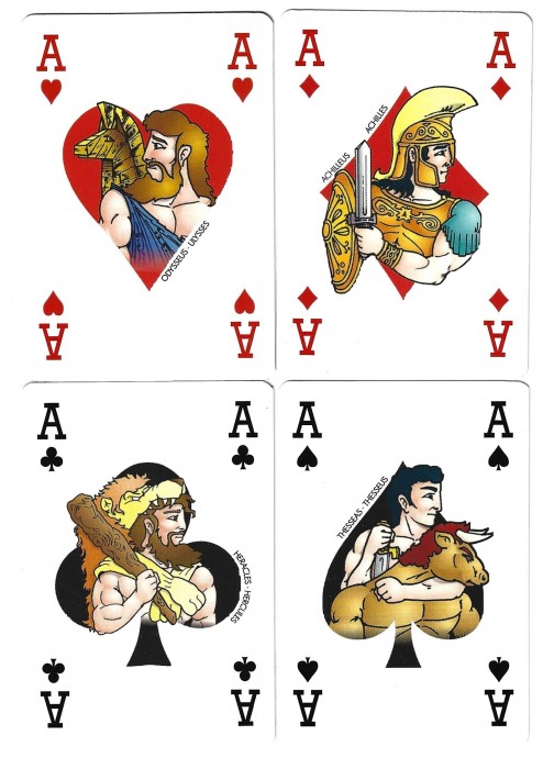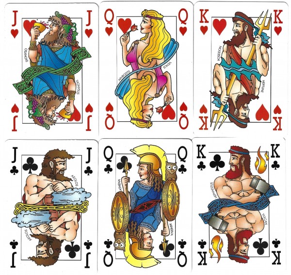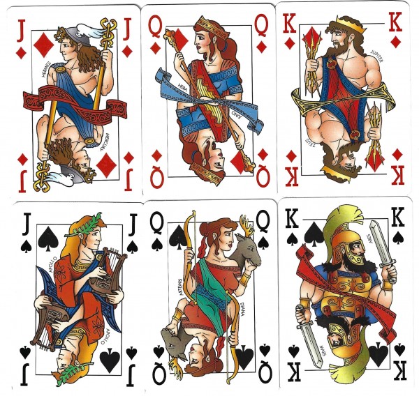 Higher quality 54 card tourist deck, including 2 jokers. Court cards represent Greek gods drawn in a cartoon style.