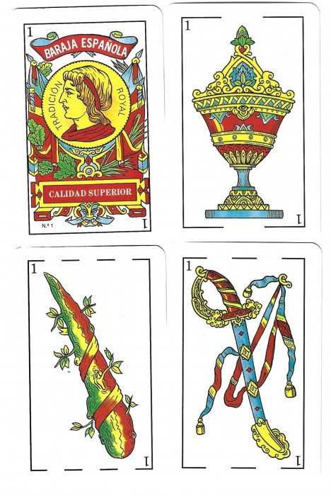 Standard Spanish tourist deck of a mid-quality card. No jokers. Suits are as follows: coins, cups, swords, clubs. Deck is housed in a clear hard transparent box.