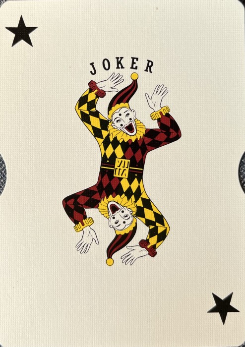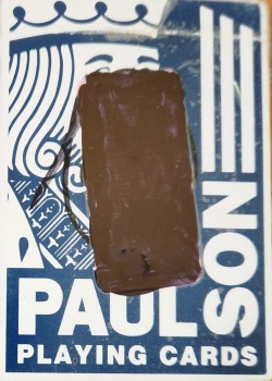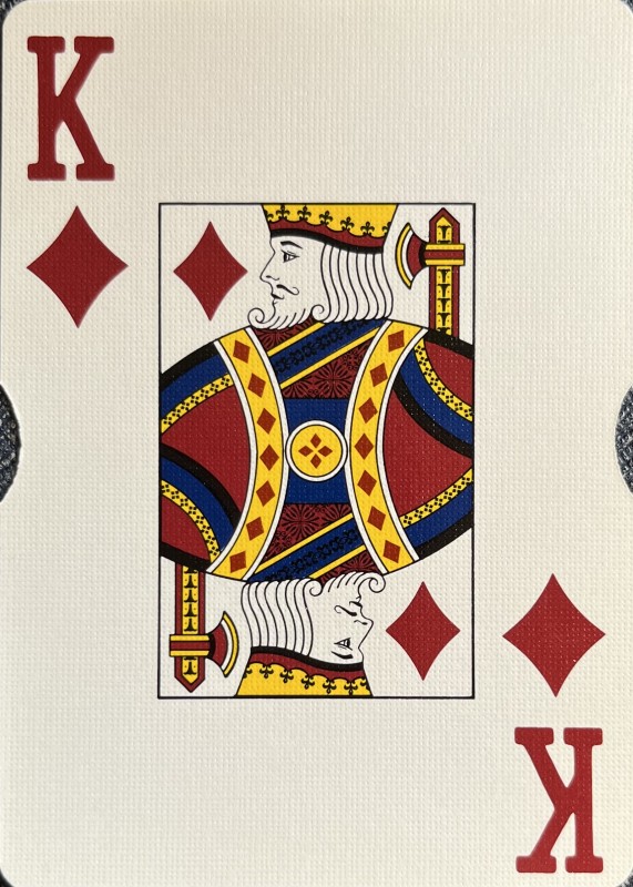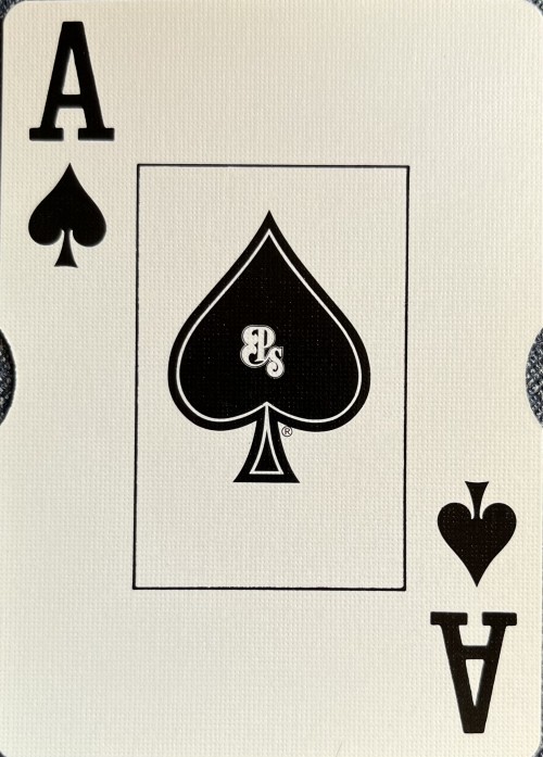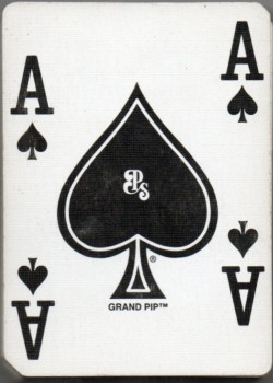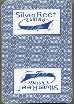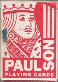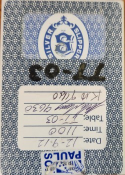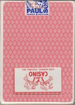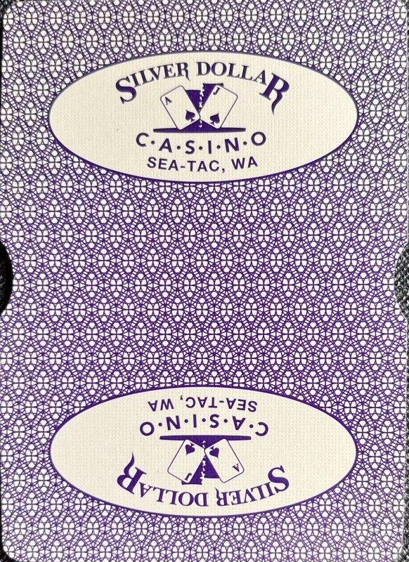 Paulson deck used during live play at the Silver Dollar Casino in Sea-Tac, WA. The deck was marked with black ink on the upper left and lower right corners, and a half circle notch was punched on each long side of the deck. Pips are jumbo for vision impaired.