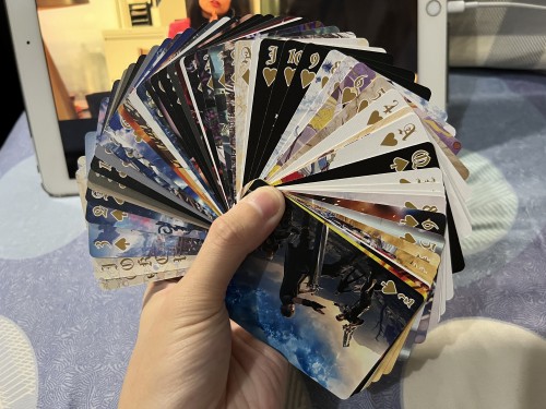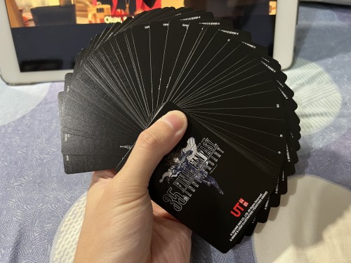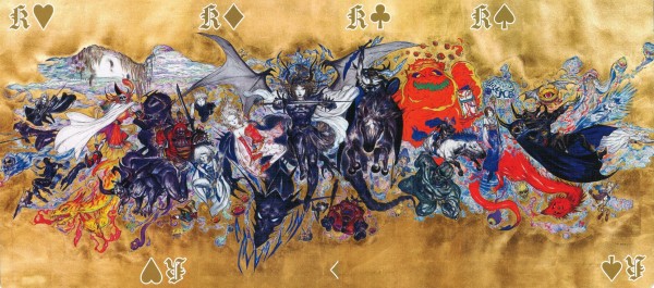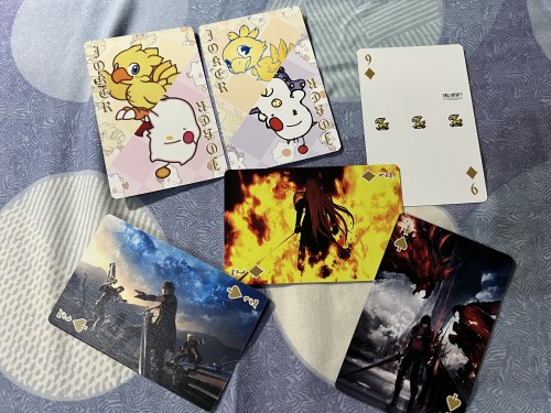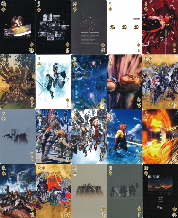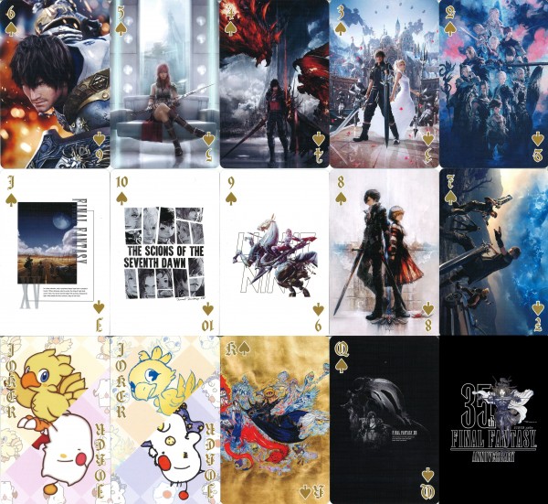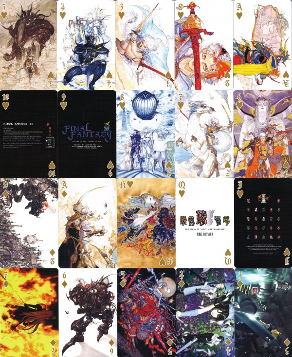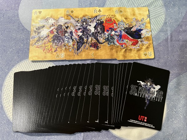Final Fantasy is a series of roleplay games established since 1987 by Japanese game company Square Enix. It had established up to 16 main games, many spinoffs, and animated full-lenght movies. In 2022, the game series celebrates it's 35th Anniversary. For this occasion, it collaborates with UNIQLO, a worlwide clothing brand, to produce an exclusive UT Collection. This UT Collection will have 16 different designs, each representing a numbered series of Final Fantasy. For a purchase of any 2 designs of the tees, a deck is given for free as long the stock lasts. This deck is bridge-sized and it fashioned to looked like a souvenir deck. All of the faces, 52 standard and 2 Jokers are featuring all of the iconic scenes and artwork from all the Final Fantasy entries from I-XV (the XVI is the upcoming entry). Most of the artworks are in portrait orientation, with the rest of them are in landscape orientation. Four Kings card will create a polyptych artwork of an ukiyo-e style art made by the designer of the game series, Yoshitaka Amano.