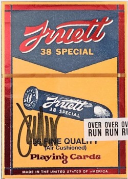 With this deck, Jackson was drawn to the bold, rich colors, of the vintage ammo box package designs. These bold colors are translated across the tuck case along with the vibrant coloring of the court cards. The Ace of spades features the Kings Wild motto: "Aim Small, Shoot Straight". The diptych joker is a recreation of the shooting manual that was included with the pistol instructions.