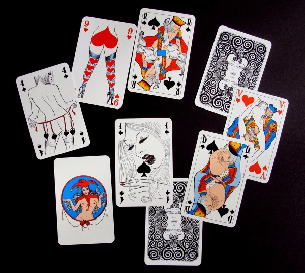 Humorous, erotic designs by Pino Zac on each card. Pip cards in semi-transformation style.