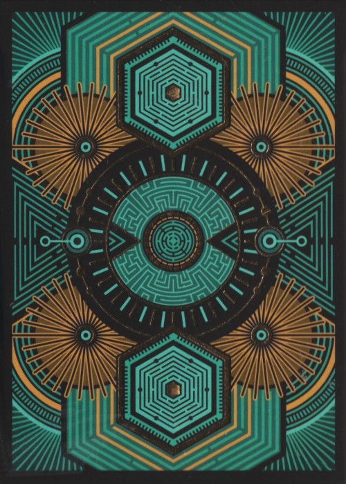 Fascinating colors, rarely found in nature. Turquoise symbolizing immortality and eternity, and the amethyst color that helps to keep a sober mind and control raging senses. Both are broken with royal gold and dark black, giving the decks a disturbingly fascinating character. What does it mean? The colors of the ocean depths, or maybe the depths of madness?