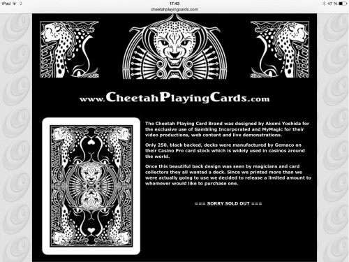 The Cheetah Playing Card Brand was designed by Akemi Yoshida for the exclusive use of Gambling Incorporated and MyMagic for their video productions, web content and live demonstrations. Only 250, black backed, decks were manufactured by Gemaco on their Casino Pro card stock which is widely used in casinos around the world.