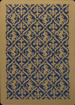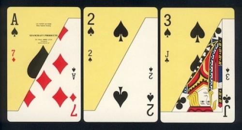 Designed by Herb Hancock of Ontario, Canada. Published by Stancraft Products of St. Paul Minn., under the brand name Hoyle. The Split Deck Playing Cards box includes two split decks, one with red backs and one with blue backs, and a rule book explaining how to adapt several games for use with the split decks: Bridge, Cribbage, Rummy, Hearts, Poker. When holding a hand of several of these cards, they can be fanned out to show the white halves, or rotated and fanned out to show the yellow halves instead. These will be two very different hands.