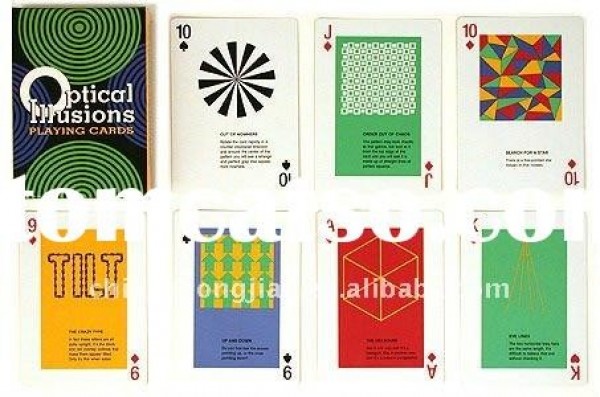 There are two ways of seeing things. And sometimes what you think you’re seeing isn’t really there at all. This playing card deck of 55 poker-size cards presents an eye-catching collection of optical illusions that fool the eyes and delight the imagination. Colors, shapes, and appearances transform themselves magically before your eyes. Each card presents a different optical illusion with an explanation of the effect. Many of the optical illusions are famous and familiar including the MacKay Effect and the Muller-Lyer Illusion. Designs in the Optical Illusions Playing Card Deck were created by Pentagram, based on the best-selling books Pentamagic (Simon & Schuster) and Phantasmagrams (Random House). This 54-card Poker deck includes two Jokers and is suitable for playing most card games. The Optical Illusion Playing Card deck is also great for travel fun. http://www.usgamesinc.com/Optical_Illusions_Playing_Card_Deck/