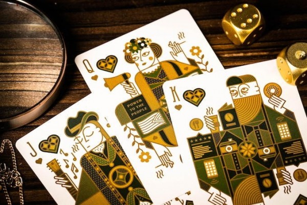 The tuck case of Empire City Playing Cards fully embodies the spirit of the city that never sleeps. At first glance, the New York City skyline is prominently featured, including iconic buildings like the Empire State, Chrysler, and the Statue of Liberty holding her torch at the corner. Each court card features a typical New Yorker going about their daily business.