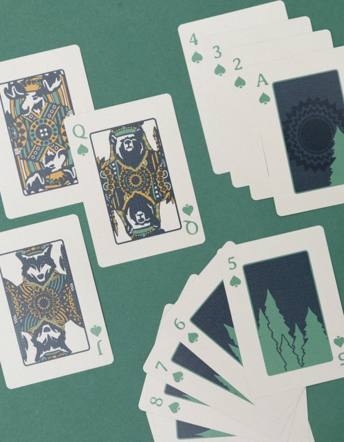 54 unique, hand-drawn woodlands designs, each card suit featuring a different wilderness. With each successive card, you see the respective suits grow and change.