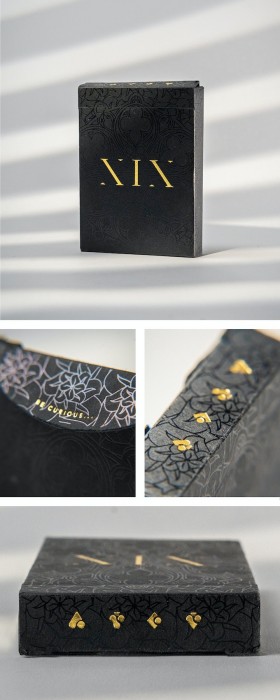ASCEND XIX’s back evokes the elegancy and mystery of the 19th century. The back design of this deck draws inspiration from the captivating XIX architecture and the intricate elements that defined that era. At the heart of the design lies a rich, unique black background that envelops the cards like a velvety sky at night. This specific black tone was selected exclusively to exude the allure of the 19th century. It's the black of top hats and ballroom gowns, of cobblestone streets and gaslit alleys. It captures the essence of an era marked by romanticism and the birth of modern creativity.