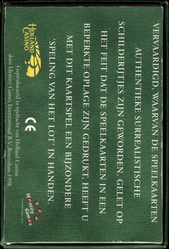 In 1998 the governement run Holland Casino opened a new casino in Valkenburg, and commissioned a special deck of cards to celebrate this occasion. Artist Con van Velsen was approached and he delivered 18 designs for the courts, aces, jokers and back. Each of them was a miniature painting by itself and they were reproduced for printing in the deck. The deck was published together with a casette, holding 36 designs of van Velsen\\\'s work, among them all 18 of the card pictures. The deck was edited by Identity Games Int. B.V. from Rotterdam and printed by Drukkerij de Ridder from Nijkerk . The cards measure 89 by 57 mm.