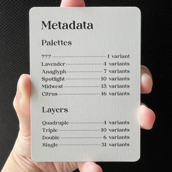 Mystery Deck by LiH, each deck has it's own pattern and colors. All the faces and backs will be all identical. Every deck will have a guide on the different variants, the metadata of the p5js generative art for the decks, and a 20 color swatches graphic card.