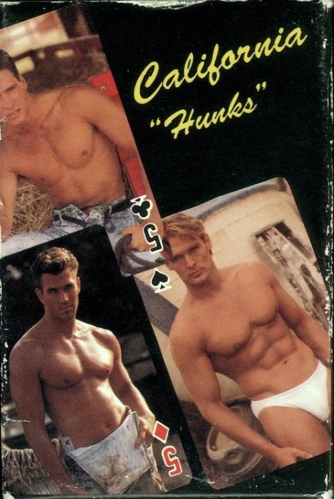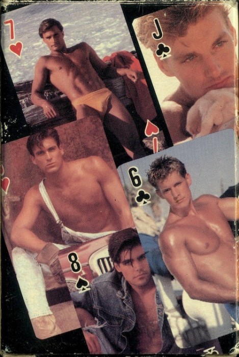 Pin-up deck of men, mostly in swimsuits. The King of Spades features Arnold Schwarzenegger from his Muscle Beach Venice days.
