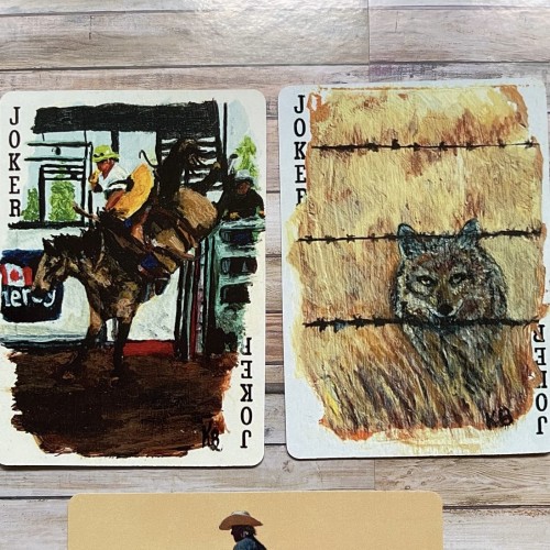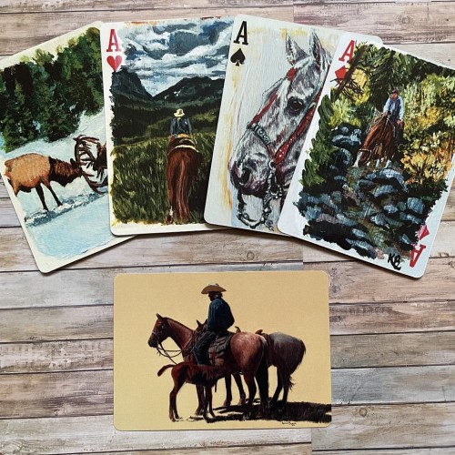 Each deck is a printed collection of art by Karmin Burton, originally hand painted on real playing cards. Every card features a different painting depicting life in rural Alberta, including cowboys, horses, wildlife, and beautiful scenery.