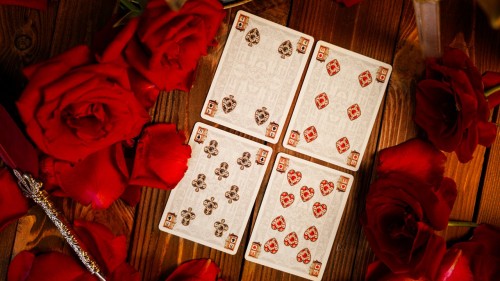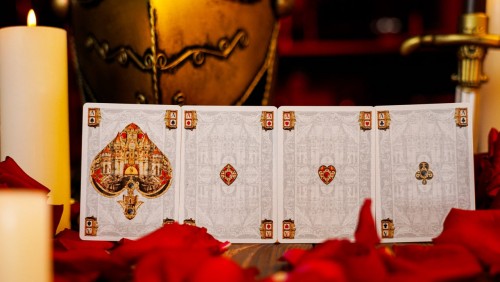 We present a classic, elegant design with embossed knights and castles on the tuck case, adorned with red foil extending to the interior. The suit designs, inspired by heraldry and embellished with gemstones, reflect the grandeur of royalty. The deck gives you the feel of royalty, travel back to medieval times when kings and queens reign, and soldiers walk around with their grand armors.