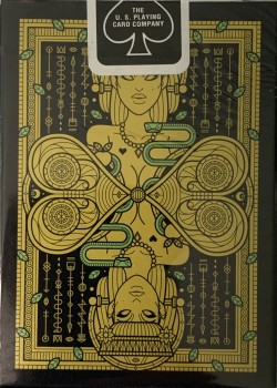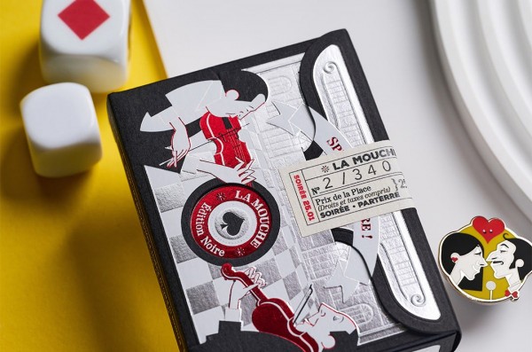 Printed in 2024 by Expert Playing Card Co. on their classic linen-finish stock and featuring silver cold foil on the faces and silver gilding on the edges, La Mouche Noire has been released in a limited edition of 340 decks. The custom-shaped tuck box has been manufactured in Italy by Boschiero & Newton, with silver, red, and white hot foil on high-quality Fedrigoni paper stock, enhanced by detailed embossing.