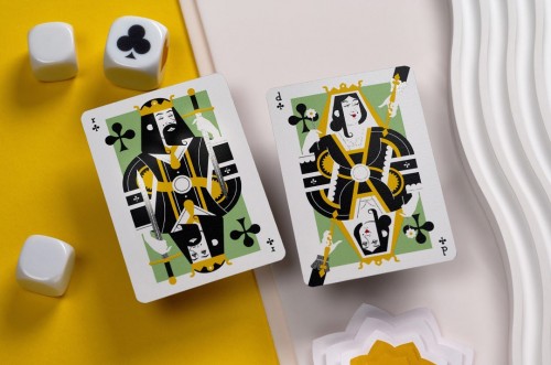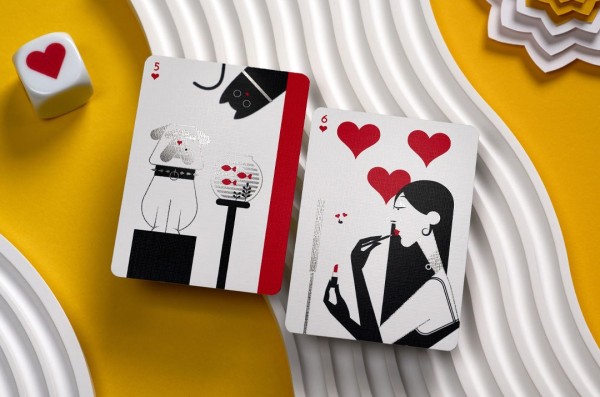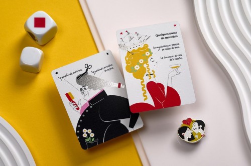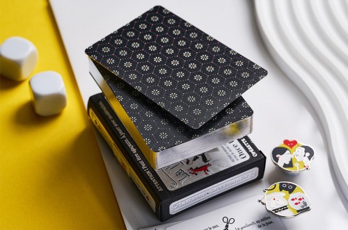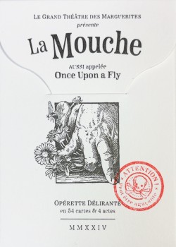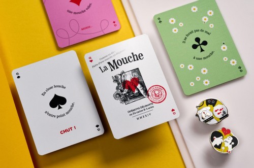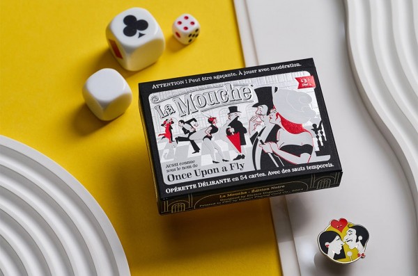 La Mouche Noire is the deluxe edition of La Mouche, with a tuck box inspired by the charming aesthetic of vintage French posters and a hand-stamped seal resembling an event ticket with numbered, limited seating. Like the Blanche deck, it consists of 54 poker-sized cards and revolves around the adventures of a fly, the mischievous protagonist sometimes appearing as an insect, at other times disguising itself as a beauty mark. Throughout the faces and reverse of the cards, you will find numerous references to repurposed playing cards from the past, as well as nods to old card games, art, literature, music, and more. You can explore more details in the Kickstarter campaign.