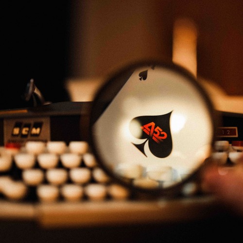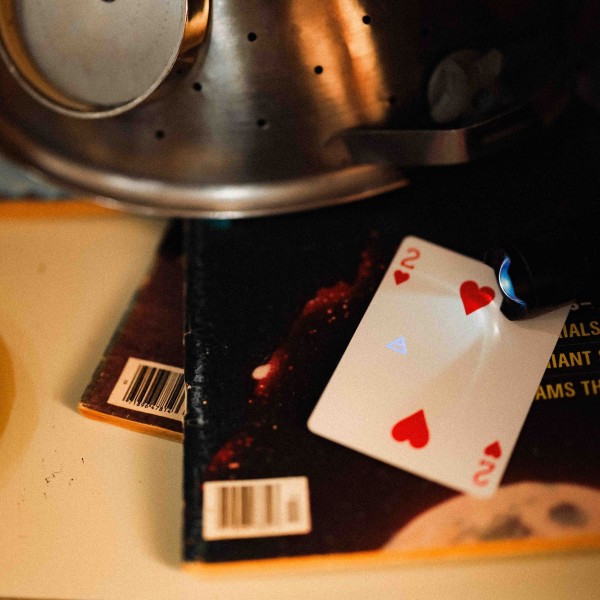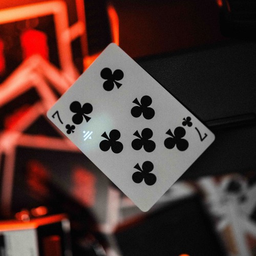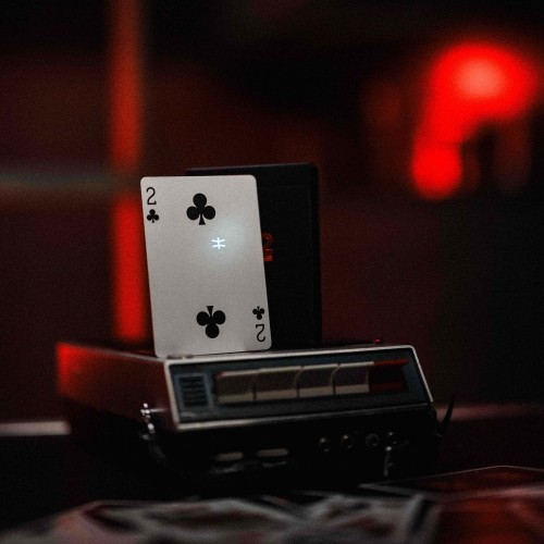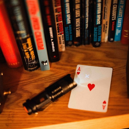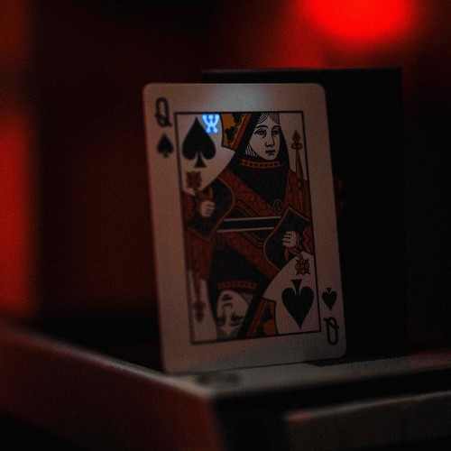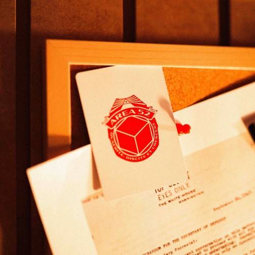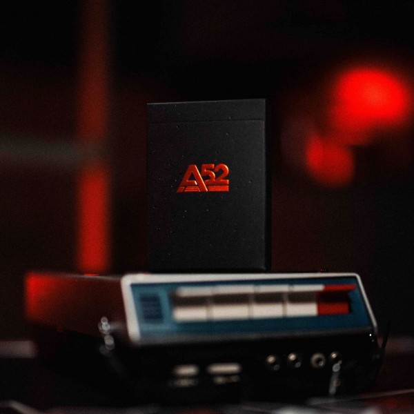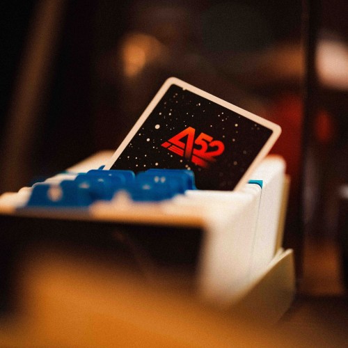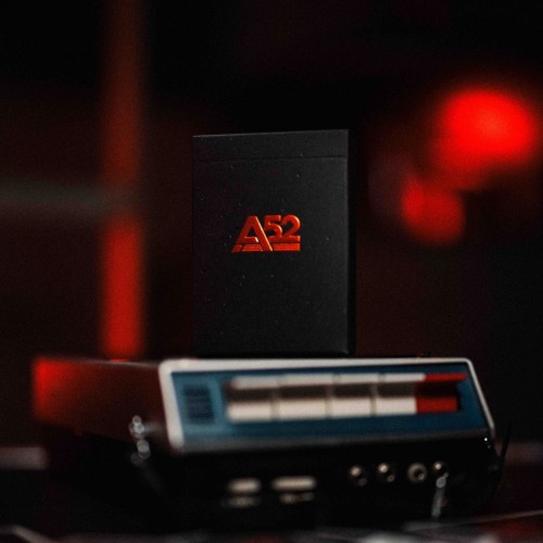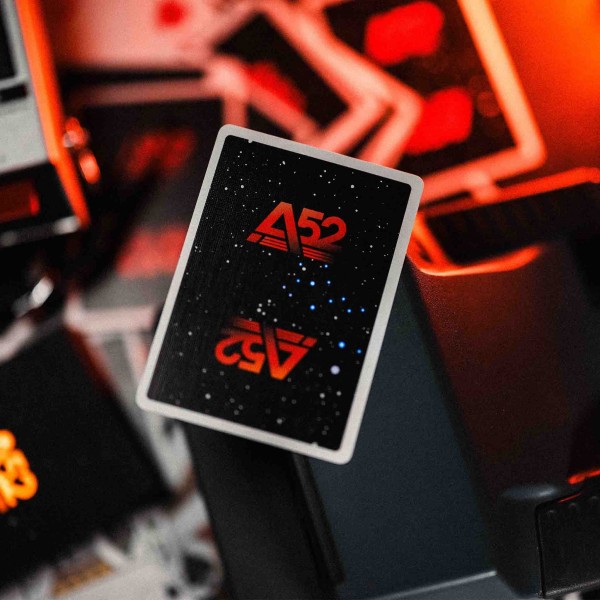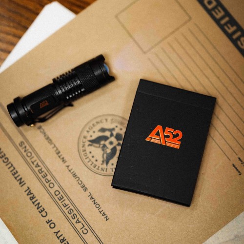 This deck of playing cards is created based on this side venture. The custom deck is printed by USPCC. The tuck box has the A52 emblem embossed on the front with black foils for the stars. It has an interior pattern of Area52 logo. The deck uses standard faces, with customized Ace of Spades and modified Courts. What special thing about the deck is that: there's a hidden UV element on every cards.