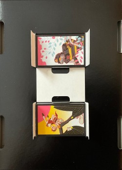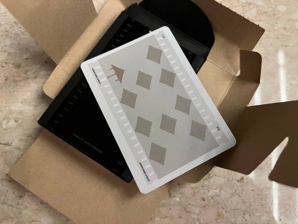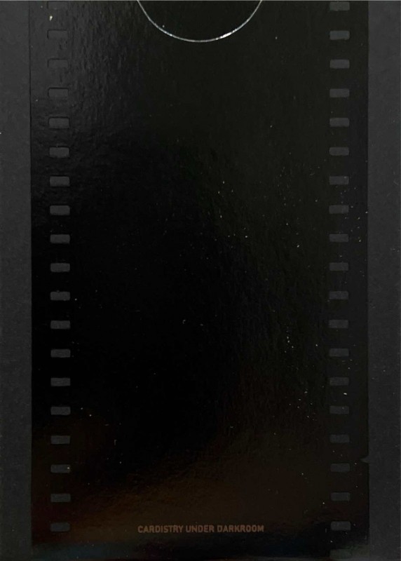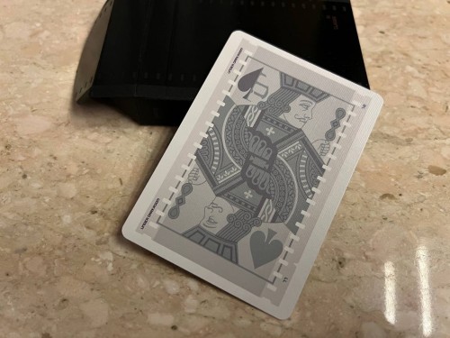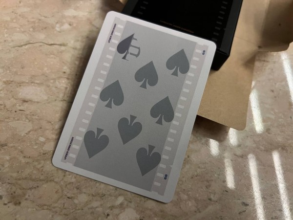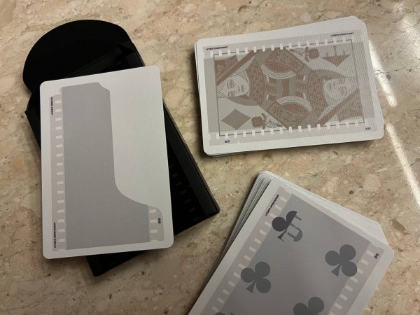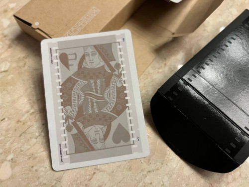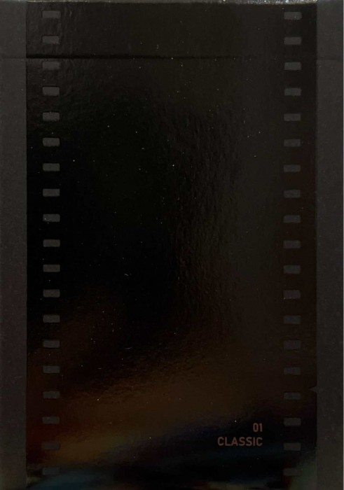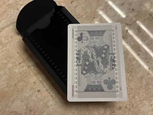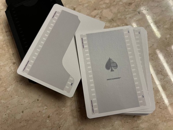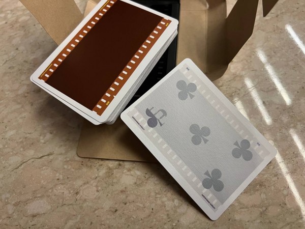 The cards design continues the theme. The card back is designed as strip segements of a film roll: white bordered with a card numbering which makes it a subtle one-way back. The faces of the cards are designed like negatives imprinted onto the film that resembles Numbers, Aces, and Courts. While the faces lack indices, the numbering can tell what card it is according to a New Deck Order. The Jokers complete the theme of the deck: one card is showing the small pull strip of a film roll, the other is a plastic card showing the title of the deck.