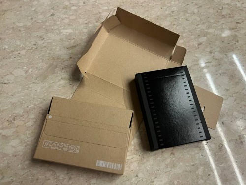 Film Playing Cards, as its name, is inspired from a camera's film roll. The tuck box is a custom double-layer box: the outer box is a deck sleeve, fashioned to look like a packaging layer of a film roll, complete with a perforated pull tab to open the box sleeve. The inner box is the main tuck box, black matte box with black foil running across the box, in shape of a film strip.