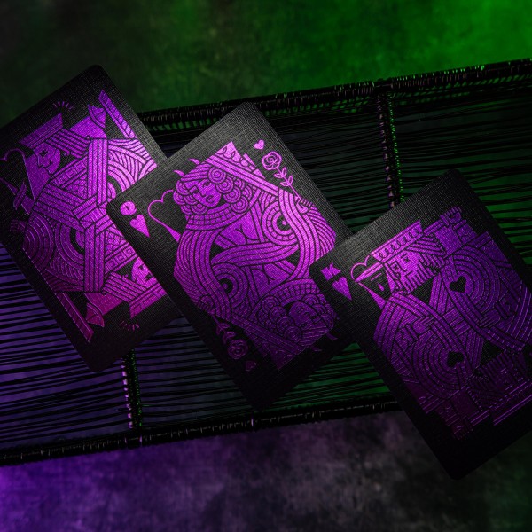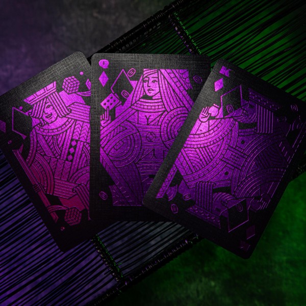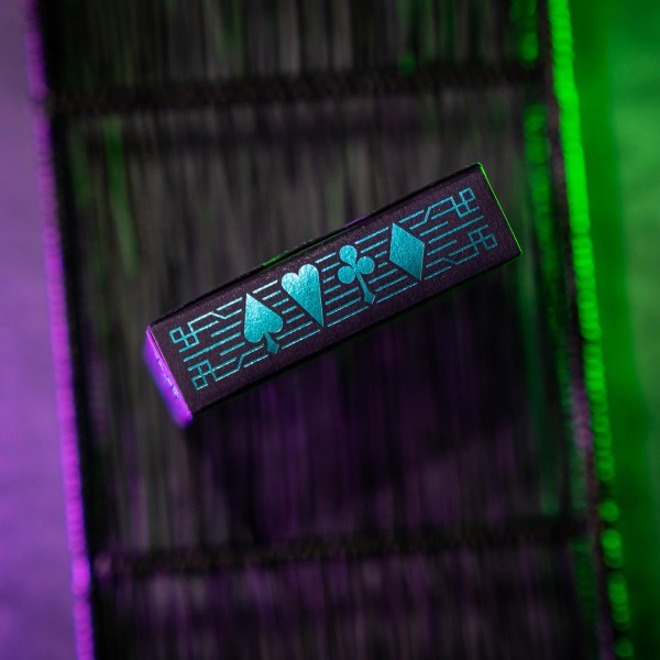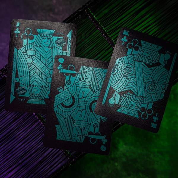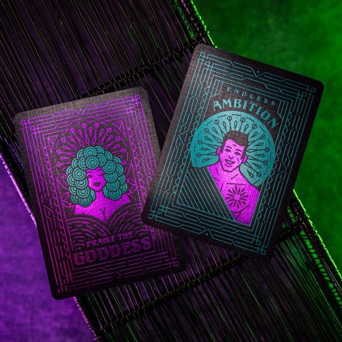Obsession is a new playing cards project explicitly dedicated to a theme that lies at the heart of many of my creations. Rapture is the experimental of the series: while being simple, elegant, and perfect for play, this deck features a striking color palette and a tuckbox crafted from luxury paper with hot foil stamping. Specially, the cards ONLY have hot foiled stamping: no ink, just only metallic foil. Also, the cards are gilded in green metallic foil