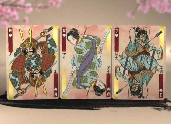 The Aces feature samurai helmets adorned with metal accessories that has the shape of respective card suit. The back ground of each cards suit are colored respectively. The indices has Japanese characters of the number and ranks. The Number Cards feature custom pips: suit drawn using traditional brush strokes. The Courts feature two-way illustrations of Japanese warriors jacks, geisha queens, and samurai kings. The Jokers feature identical illustration of demon masks, colored red and blue respectively. The extra two cards form "Ronin" in stylized Japanese characters. For the artworks, on every metallic details (such as the weapons or armour metal ornaments) along with the golden strips on every card are finished with gold cold foiling.