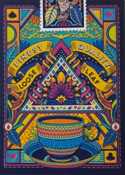 The court cards of each suit are represented with a different regional tea blend. The Spades tea house serves Nilgiri, the Hearts serve Darjeeling, Clubs serve an Assam blend, and the Diamonds tea house serves a Kangra tea. The royals of each teahouse have matching ceremonial robes and are adorned with ornate teapots, spoons, coiled snakes and steaming cups of chai.