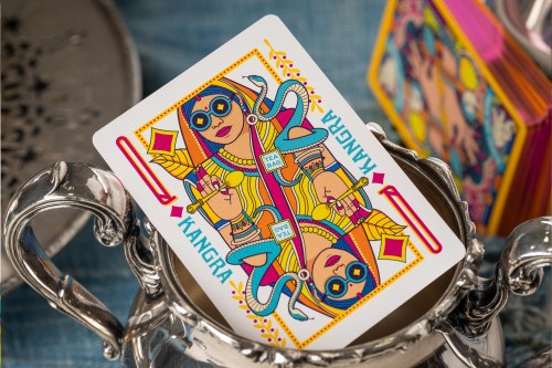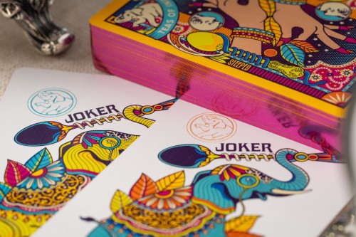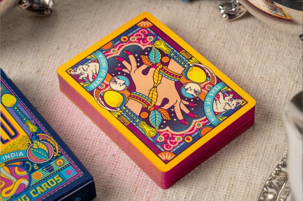 STEEPED (Teas of India) playing cards, the deck that enters the world of the Indian Chai Wallah. Designed using the Indian maximalist style, bold and vibrant, but also reminiscent of an elegant box of tea leaves. Neon colours contrast with the traditional style of engraved silverware to make this deck pop. printed using Viper Finish with a luxurious embossed, pearlescent Tuck Box.
