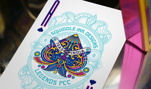 The Ace of Spades features a bold, ornate central design with a subtle background motif celebrating the collaboration between Squiddle Ink and Legends PCC. The Joker cards feature a decorative Indian elephant, wielding an oversized teaspoon in its trunk. The pip cards feature a detailed background motif that celebrates the chaiwalla of each tea house.