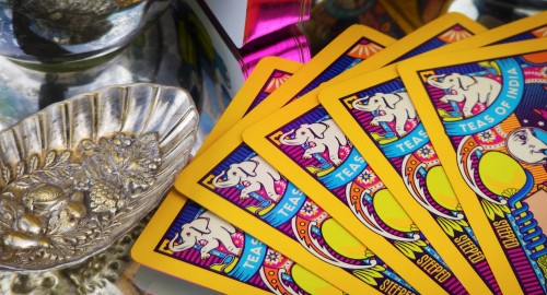 Inside the box, a mustard diamond pattern contrasts with the flash of pink from the shimmering, foil-gilt cards. The card back depicts elegant hands holding tea leaves with traditional Alta red-dyed fingertips. A small elephant sits in the corner of each card, adding a fun detail when the deck is fanned.