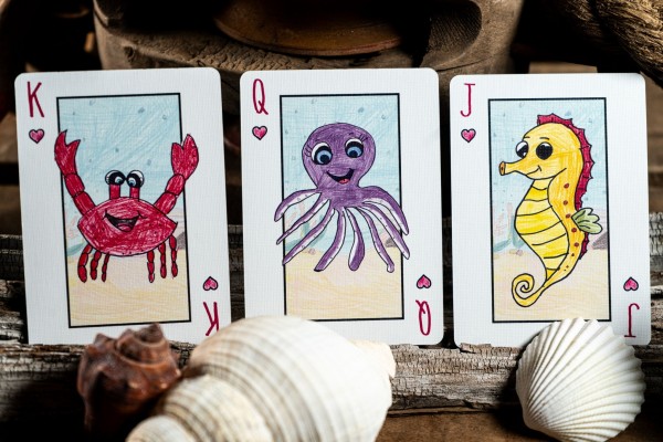 Dive into a world of imagination with Under the Sea, a whimsical deck of playing cards brought to life through the eyes of young artist Olive Robinson. Each card is hand-drawn with joyful charm, full of bright colors, smiling sea creatures, and plenty of underwater personality. Every face cards tells its own story. The deck is complete with all four suits, each one swimming with adorable ocean characters: