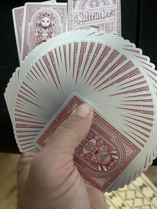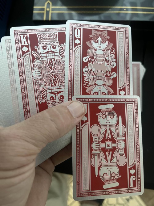 Step into a world of holiday magic with the Nutcracker Deck, a luxurious tribute to the timeless Christmas tale. Every detail has been carefully designed to capture the wonder of the season, from the fully custom court cards inspired by the characters of the Nutcracker story to the enchanting artwork that makes each hand feel like a scene from the ballet. The tuck box glistens with elegant gold foil, adding a festive shine that looks as beautiful on display as it does in hand. Perfect for collectors and players alike, this deck brings both artistry and functionality to the table. Whether you’re shuffling on Christmas Eve or gifting to a loved one, the Nutcracker Deck is the ultimate holiday keepsake—one that brings joy and tradition to every game.