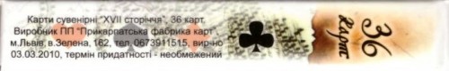 These playing/gift/souviner cards (Сувенирные карты) 17th Century (XVII століття) are from the Ukraine produced by NoirArts / Roman Kotiv under another brand for the local Ukraine market. UPC 4820138450036