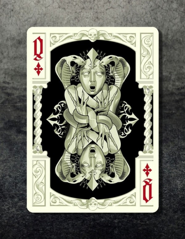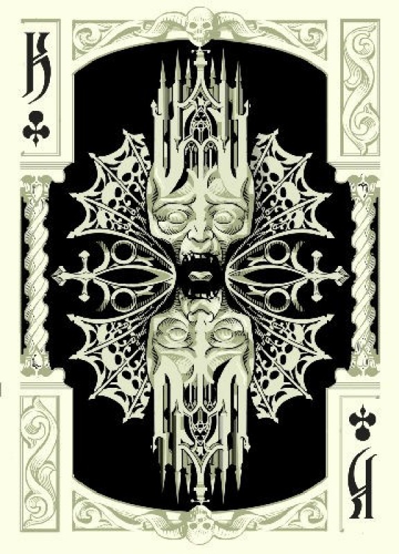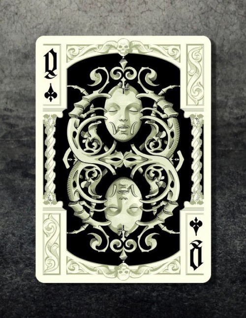 Grotesk Macabre is the evolution of "Grotesque", which was the UC2014 annual deck. Taking this deck as a starting point, I tried to create my own vision of the Underworld. Although a joyful and positive person myself, I had always been attracted to dark themed artwork. I find fascinating how artists throughout the centuries have imagined the world of the dead and how they dealt with the greatest fear of mankind. In Grotesk Macabre I tried to combine the darkest of all themes with the heavy elegance of baroque and the pointy, flamboyant Gothic art.