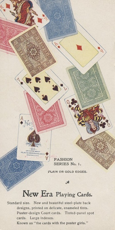 From WOPC - Around 1895 the recently incorporated United States Playing Card Company began creating exciting new brands featuring different, or non-standard, court cards in order to celebrate their new beginning and to keep up with the increasingly competitive market. “New Era No.46” was the first of these colourful new decks, based around European fashions with an Art Nouveau flavour, and was soon followed by “Circus No.47”, “Hustling Joe No.61” and “Ye Witches No.62”. These titles were listed in catalogues for a few years but today they have become very scarce to find.