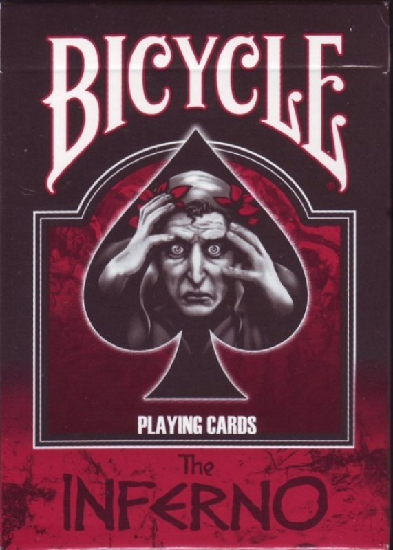 This is the extremely rare Stripper Deck version of The Inferno playing card deck. It is verified that there were only 144 stripper decks printed by USPCC. You can tell the Stripper Deck version from the regular version by the green star sticker on the back, and of course because the cards are cut at a slight taper.