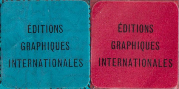 Each deck is packed in a folded cellophane wrapper which leaves the cornes open. Its closed by a red/blue seal on the back with the text "ÉDITIONS GRAPHIQUES INTERNATIONALES" on it.