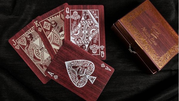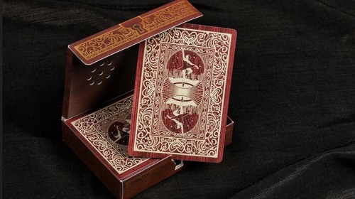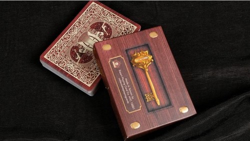 The deck is complete with a dark cherry wood design finish with raised gold foil. It is a stunner design and one that was crafted to look as authentic as possible. The flap lifts up from the keyhole where the cards lay awaiting to be played with.