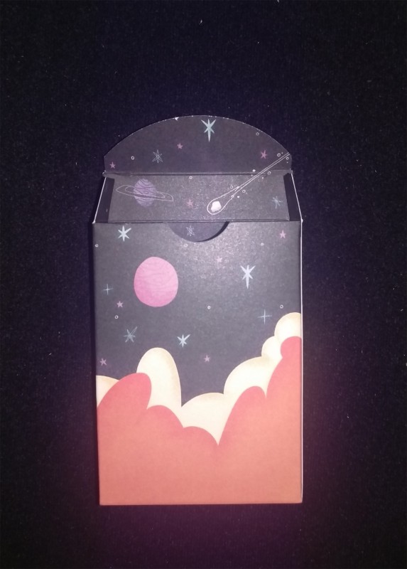 The box attracts the eyes right away with an undulating landscape in the shades of purple. As you inspect the box, you suddenly find yourself on a new planet whose mountainy skyline is lined with a breath-taking view of a plethora of planets and constellations. On the top of the box, we meet the first character of the story, who seems to be floating through space, as she stepped out of her space shuttle onto the strange land. Open the box and follow her on the adventure.