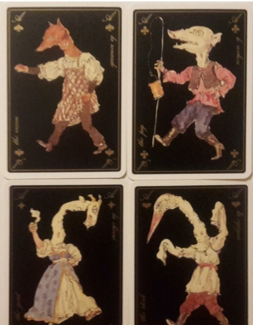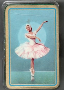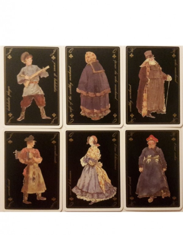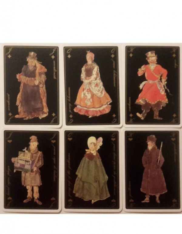 Ballet Petrouchka deck was printed by Grimaud in 1988. The Courts, Jokers and Aces feature characters in their costumes from Ivan Stravinsky's famous ballet. The designs are based on an opera performance from Paris Opera in 1948. The background and the style resembles Russian Black Palekh style cards.