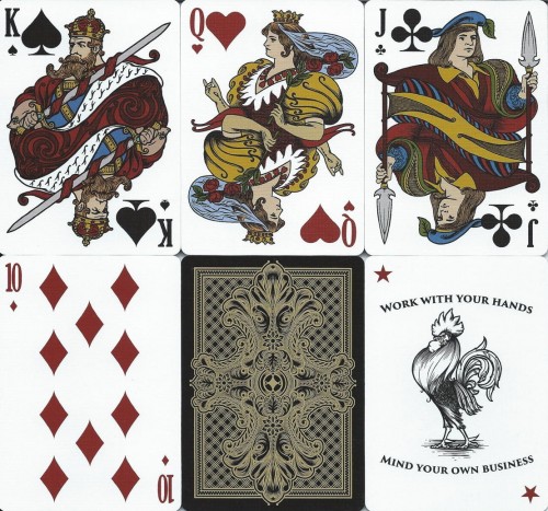 Intaglio is a series of prints & playing cards derived from hand engraved copper printing plates printed in the traditional Intaglio style in a collaboration between Kings Wild Project and Thornwillow Press in New York. Intaglio printing for playing card art has not been used for centuries. There were 3 versions/colors of the deck produced: red, blue and black (which was a KickStarter exclusive).