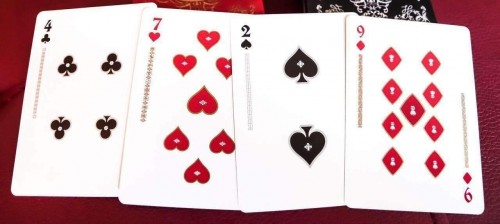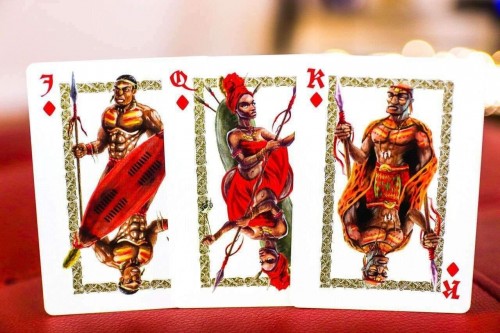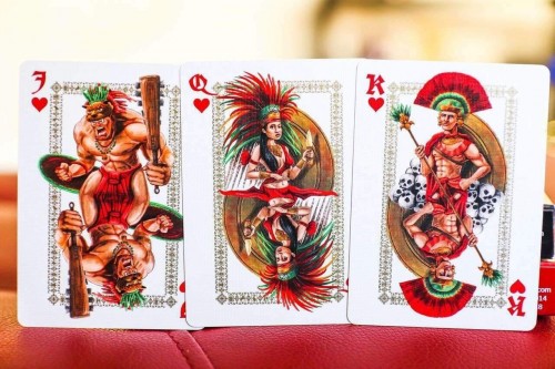 Inspired by past civilizations from around the globe and combining traditional and nontraditional playing card design techniques and concepts to bring you a stunning all purpose deck. Liberal use of metallic inks used on the fronts, backs and tuck case to add to the beauty of the design. Besides a tuck case reveal you may find some additional ones on the cards. Release your inner warrior!