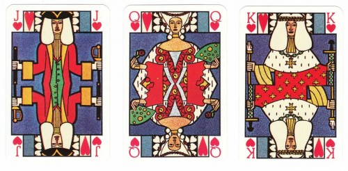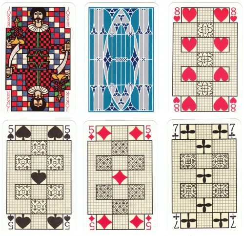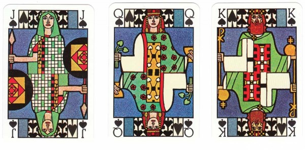 Jugendstil Art Nouveau Playing Cards were first released as a 54-card “Tarock No.1” by Joseph Glanz & Albert Berger in 1906, including 22 trump cards. The set was designed by Ditha Moser in Jugenstil style – the German equivalent of Art Nouveau with its preference for straight lines and simple geometrical forms which in this case resemble stained glass windows. Piatnik re-printed the 12 court cards with a full set of number cards as “Jugendstil Art Nouveau Bridge Nr.2136” in 1980. The Hearts court cards are dressed in Louis XVI period fashion, the Clubs courts appear as crusading knights (German Chivalry), the Diamond court cards are clad in ancient Egyptian style and Spades are inspired by the Edda sagas (Byzantium/early Christendom).