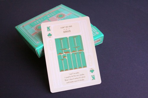 We are excited to offer this exclusive poker deck featuring original artwork showcasing 54 quotes from legendary East and West Coast artists. Ace, King, Queen, and Jack cards include Rakim, Ice Cube, Nas, Lauryn Hill, Snoop Dogg, KRS-One, 2Pac and more.