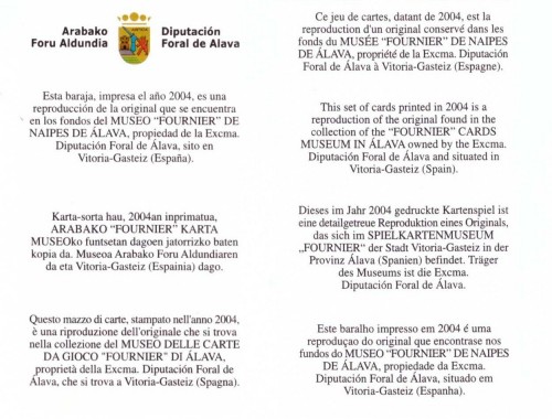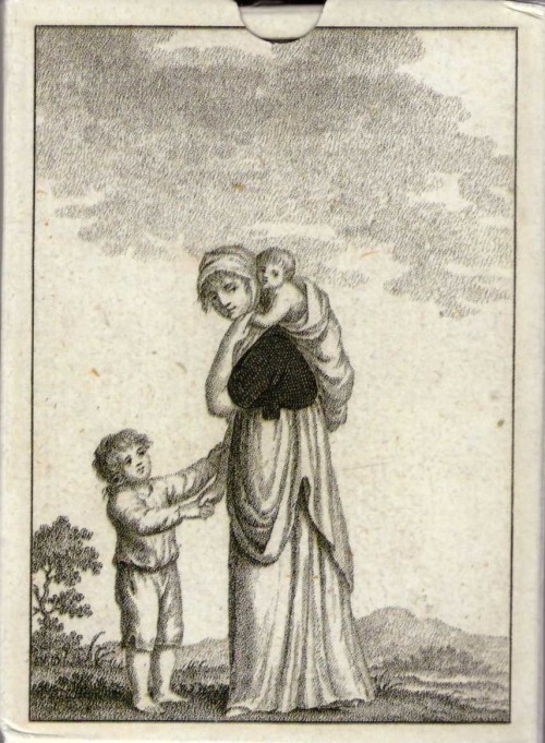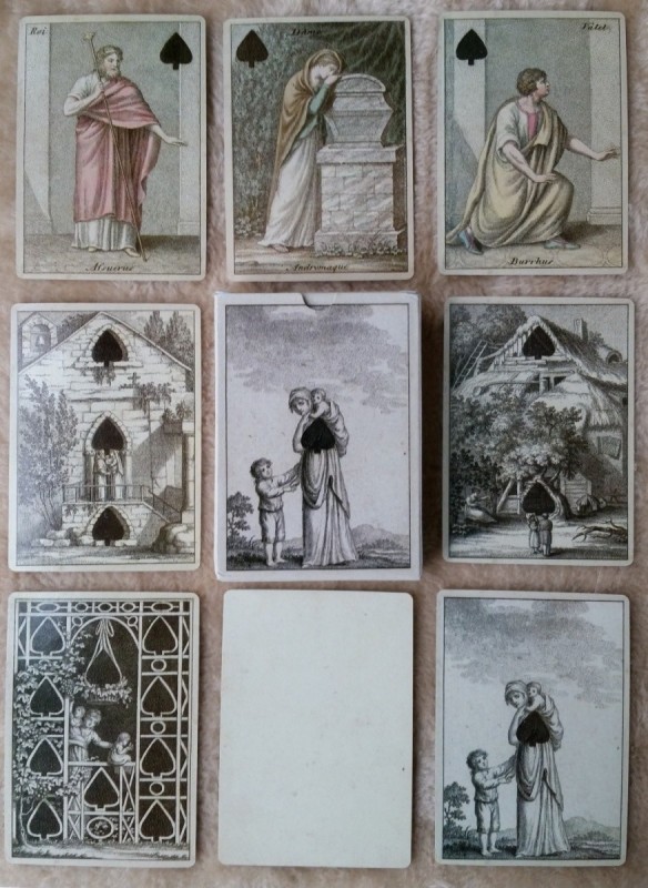 The very first transformation deck issued by Cotta is from 1805. This deck is probably the most famous of all six, and is incredibly scarce. Original illustrations were fiddling artworks done by hand, on copper plates that were manually engraved with stipple and etching, and the cards were printed on linen period stock that was 97 mm x 69 mm in size, with blank card backs and squared corners at that time. Only the court cards were hand-colored, while the number cards used red stencils.