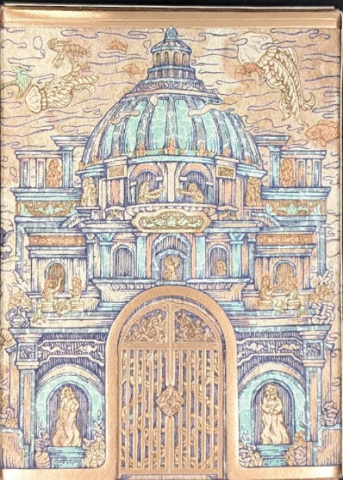 The allure of the Seven Wonders is captured in the Die-cut Window Tuck Box, a centerpiece of this release. A window is punched out of the embossed and hot-foiled tuck box, allowing us to peer into days past, where the Hanging Gardens of Babylon takes center stage as our 55th custom face card.